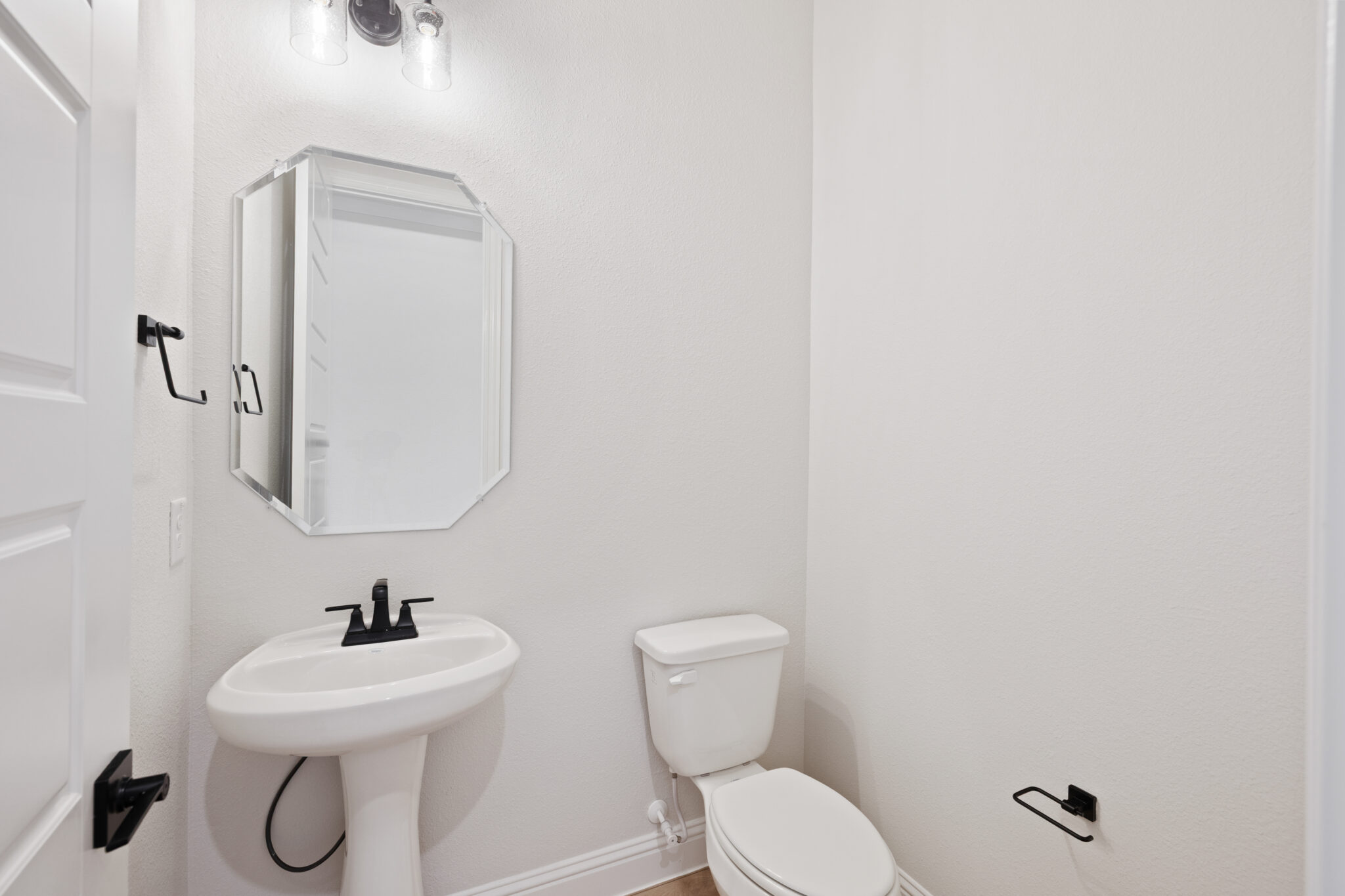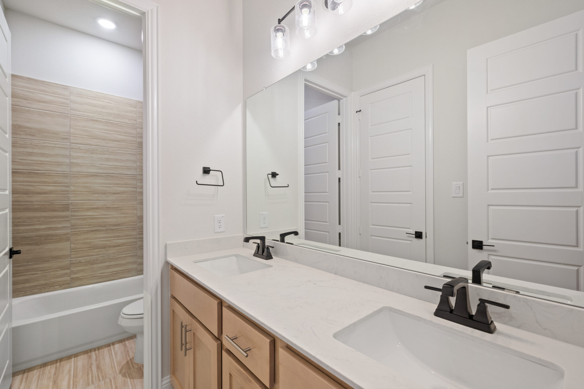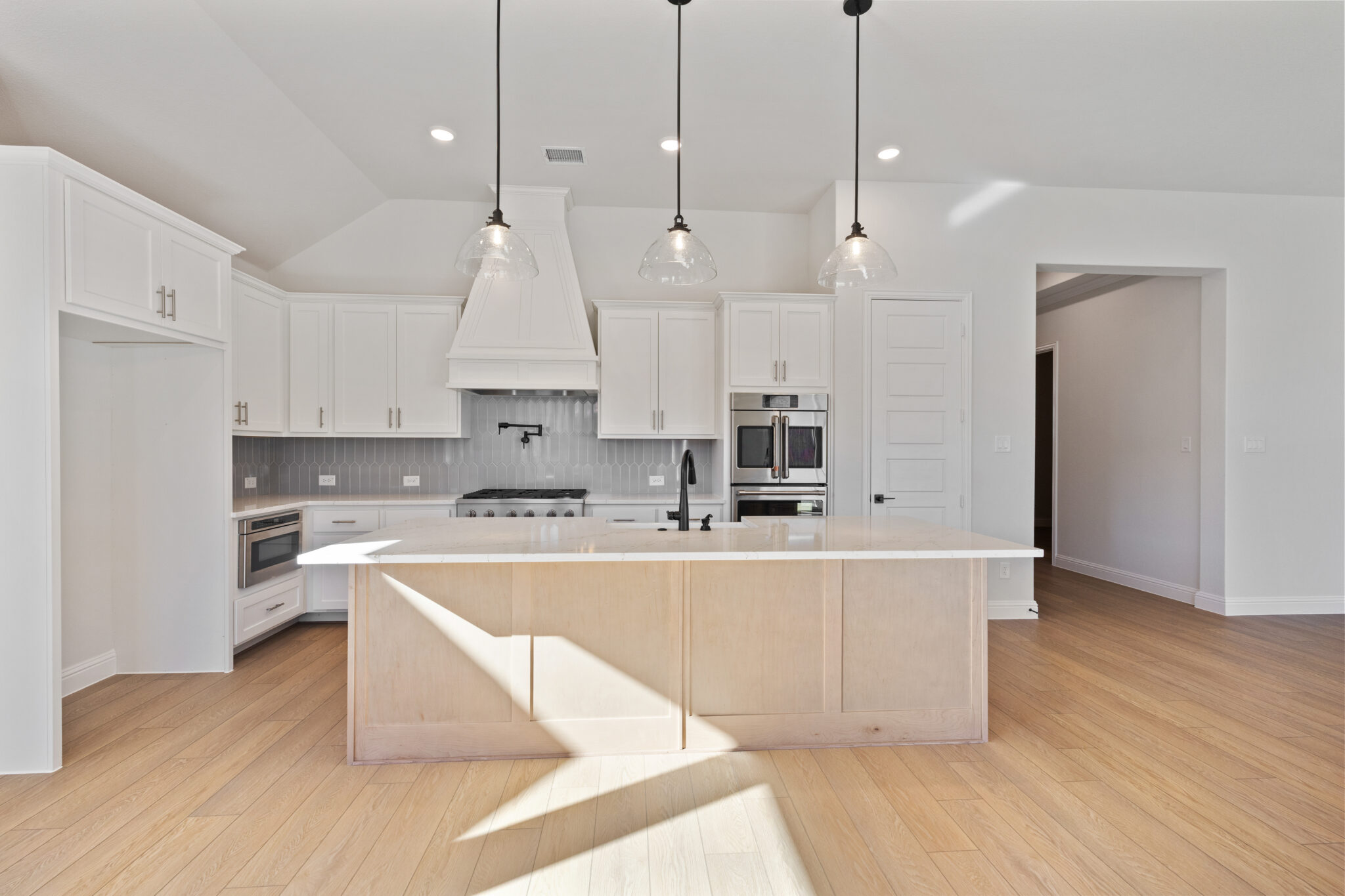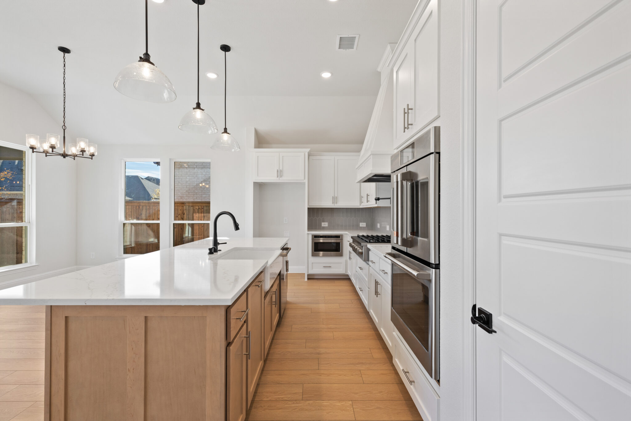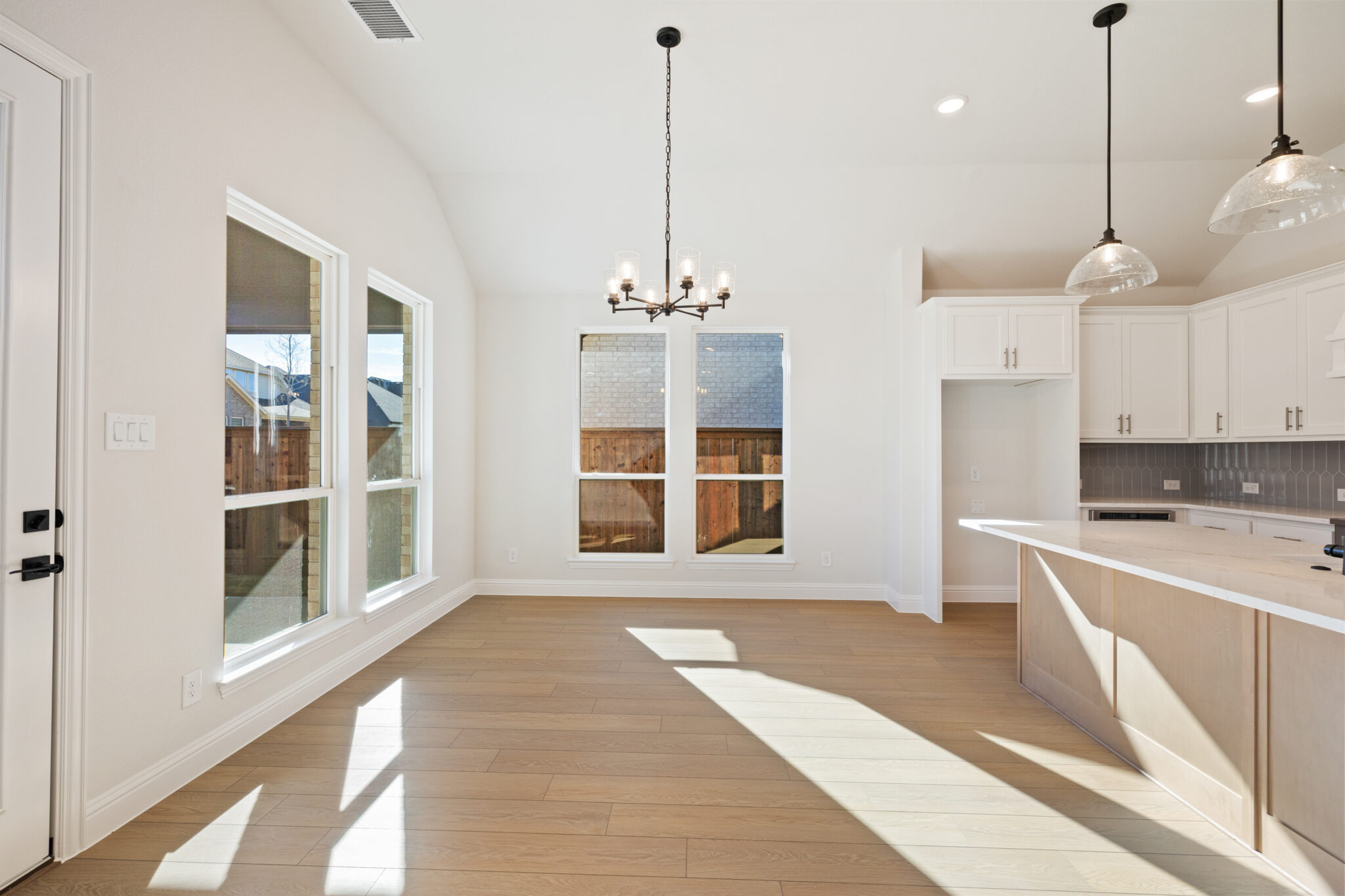 The design selections for 2814 Burnely Court highlight a creative blend of modern and decorative touches. Pale wood-look vinyl flooring pairs with a neutral carpet for comfort, while the kitchen showcases clean white countertops, Extra White painted cabinetry, and bold black hardware. A standout patterned tile adds personality, complemented by a soft gray backsplash and sleek finishes. The bathrooms continue the understated elegance with marble-inspired surfaces, while the secondary bathroom introduces patterned tile for extra visual interest. This design strikes a perfect balance between timeless style and distinctive detail.