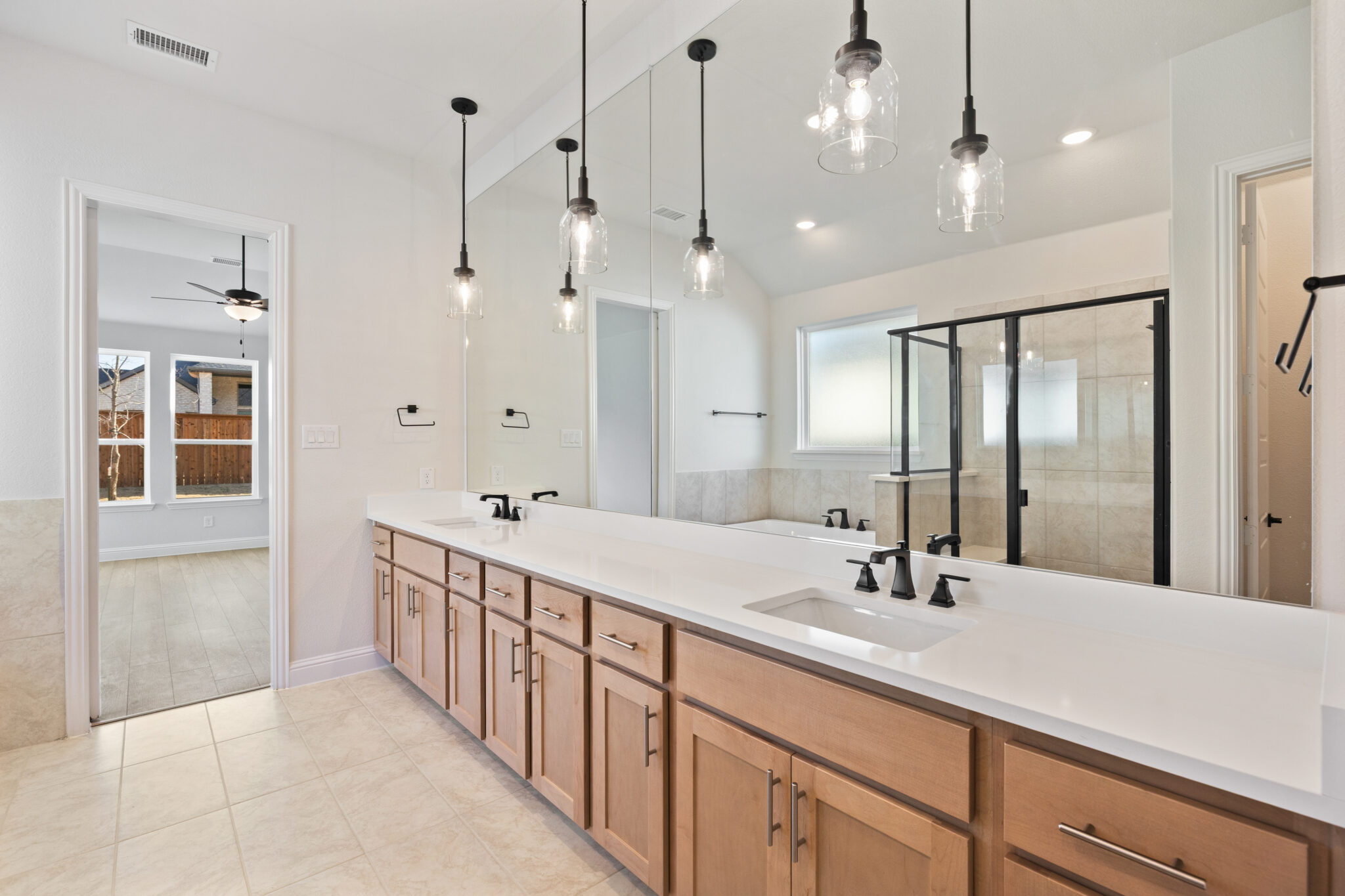 This expansive single-story design offers 4 bedrooms, 3.5 bathrooms, a study, and a media room, blending open living with private retreats. At the heart of the home, the family room flows seamlessly into the dining area and chef-inspired kitchen, complete with a large island and walk-in pantry. The primary suite provides a luxurious retreat with a spa-like bath and oversized walk-in closet. Three additional bedrooms, each with walk-in closets, are thoughtfully placed for privacy, with convenient access to full baths. A dedicated study and spacious media room add versatility for work and entertainment. Outdoor living is elevated with a 34-foot covered patio, ideal for gatherings and relaxation. A three-car tandum garage with extra depth, along with a mudroom and laundry room, ensures both convenience and functionality.