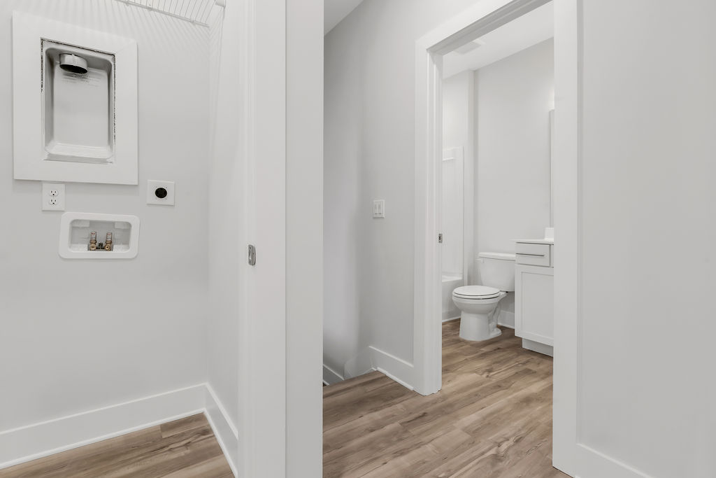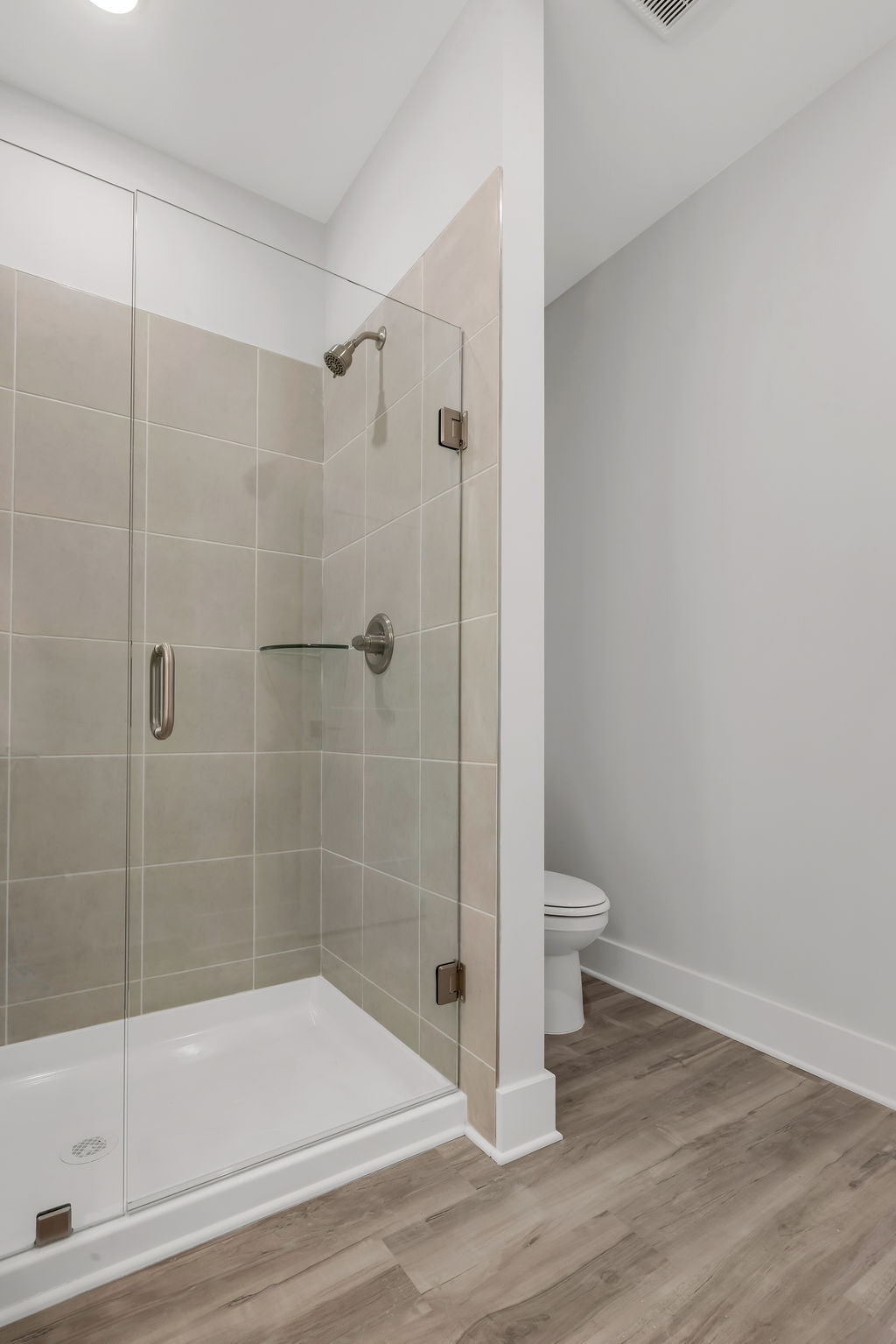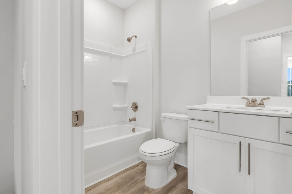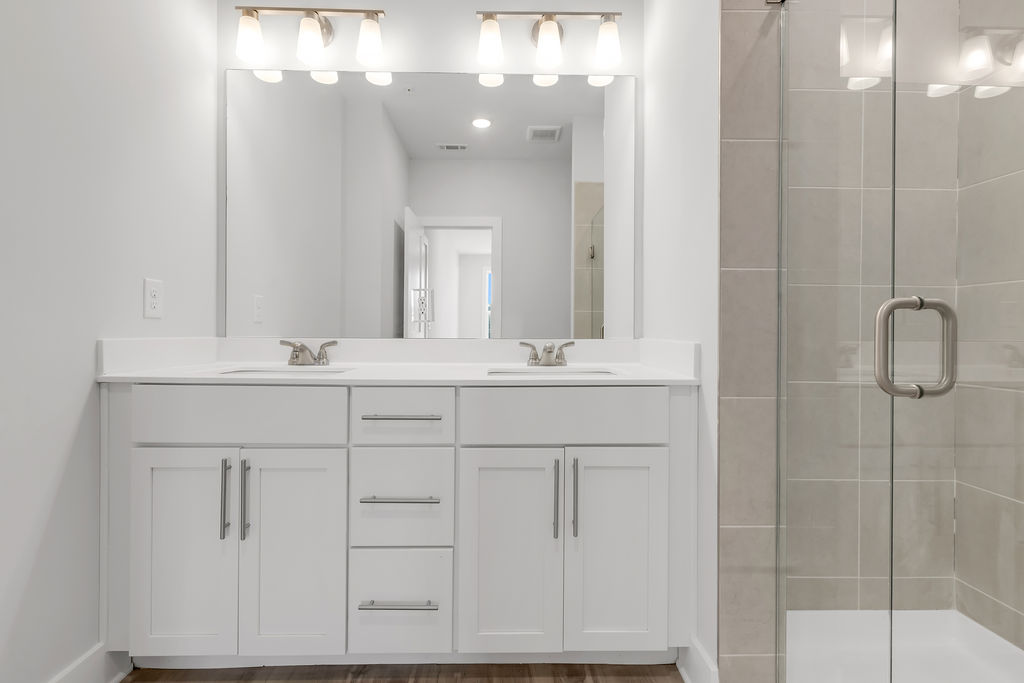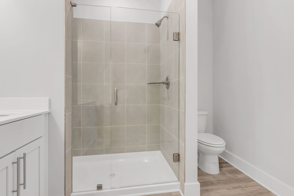 The Burton plan is a two story contemporary condominium with a layout both practical and well-suited for entertaining. Upon entry, you’re met with a sophisticated open-concept first floor living area which features a seamless flow from living room to dining room and kitchen. Garage entry is connected to the kitchen in the back of the space with a convenient powder room as well. Downstairs is the perfect space for lifestyle and entertaining, while the second floor provides privacy for the secondary bedroom and the beautiful primary suite. Highlights include a decadent primary bathroom with his and hers sinks and a spacious walk-in closet and laundry located just across the hall.