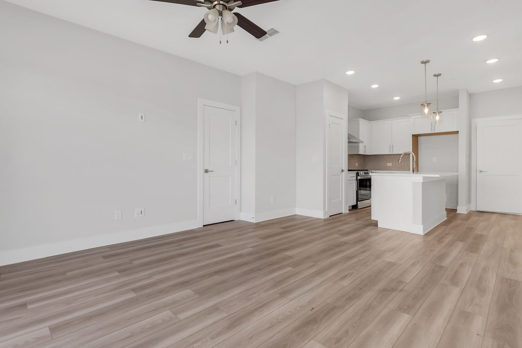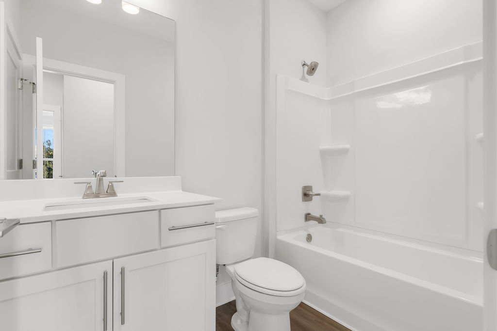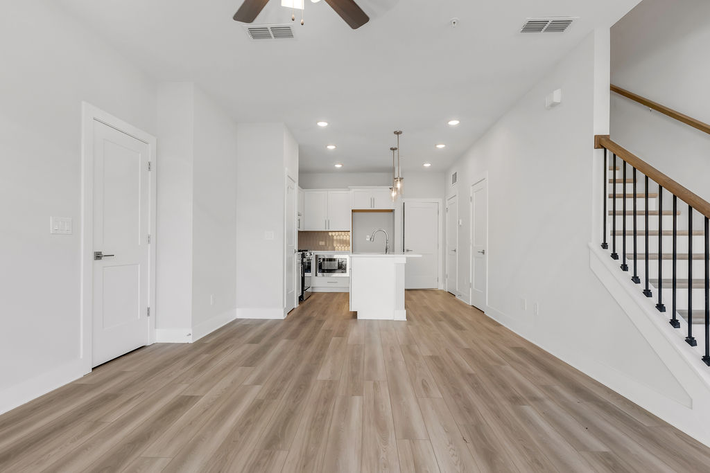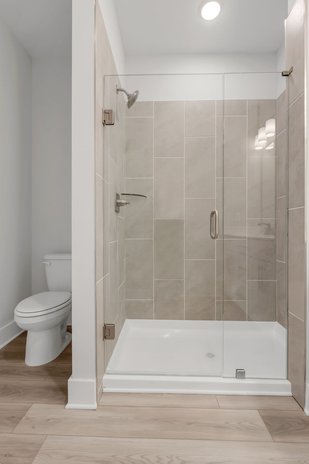 The Burton plan is a two story contemporary condominium with a layout both practical and well-suited for entertaining. Upon entry, you’re met with a sophisticated open-concept first floor living area which features a seamless flow from living room to dining room and kitchen. Garage entry is connected to the kitchen in the back of the space with a convenient powder room as well. Downstairs is the perfect space for lifestyle and entertaining, while the second floor provides privacy for the secondary bedroom and the beautiful primary suite. Highlights include a decadent primary bathroom with his and hers sinks and a spacious walk-in closet and laundry located just across the hall.