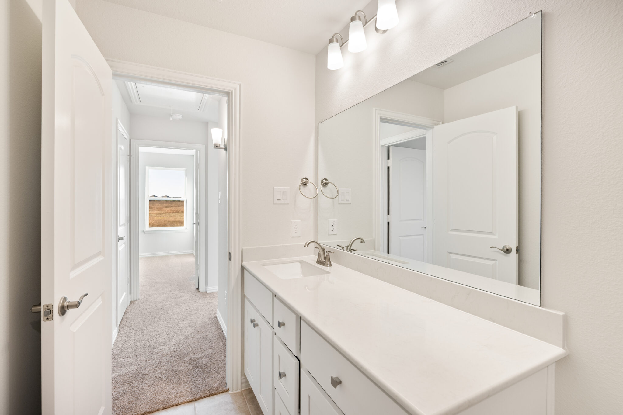 The design selections for 1111 Butterfly Dale Drive blend warmth and contrast. Rich wood-look laminate flooring pairs with medium-toned carpet for balance. The kitchen features a clean light countertop, accented by a soft gray backsplash and painted Breeze cabinets with modern hardware. The primary bathroom offers a subtle stone-inspired finish, while the secondary bathroom introduces a light stone palette. A warm handrail stain ties the look together, creating a timeless, inviting design.