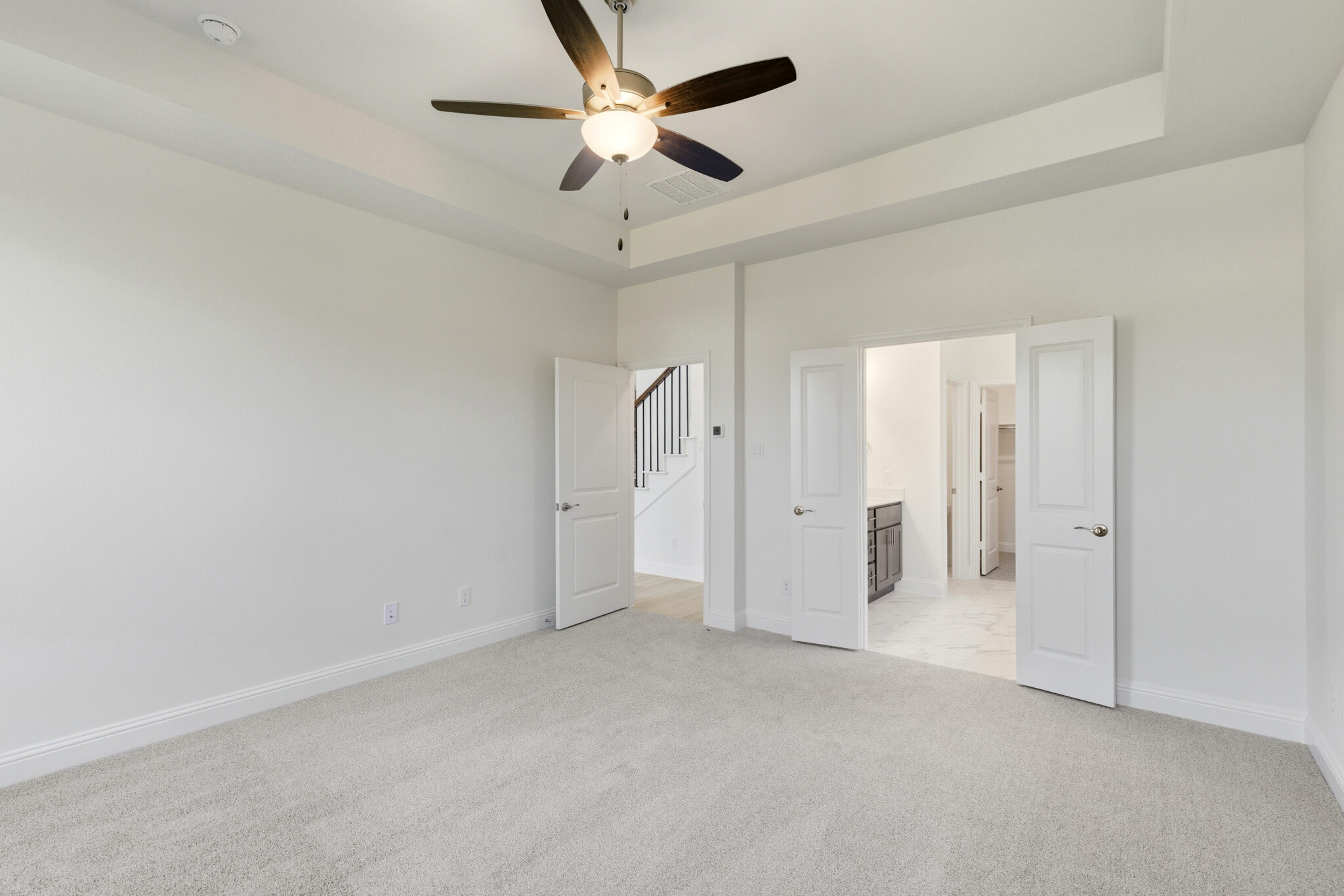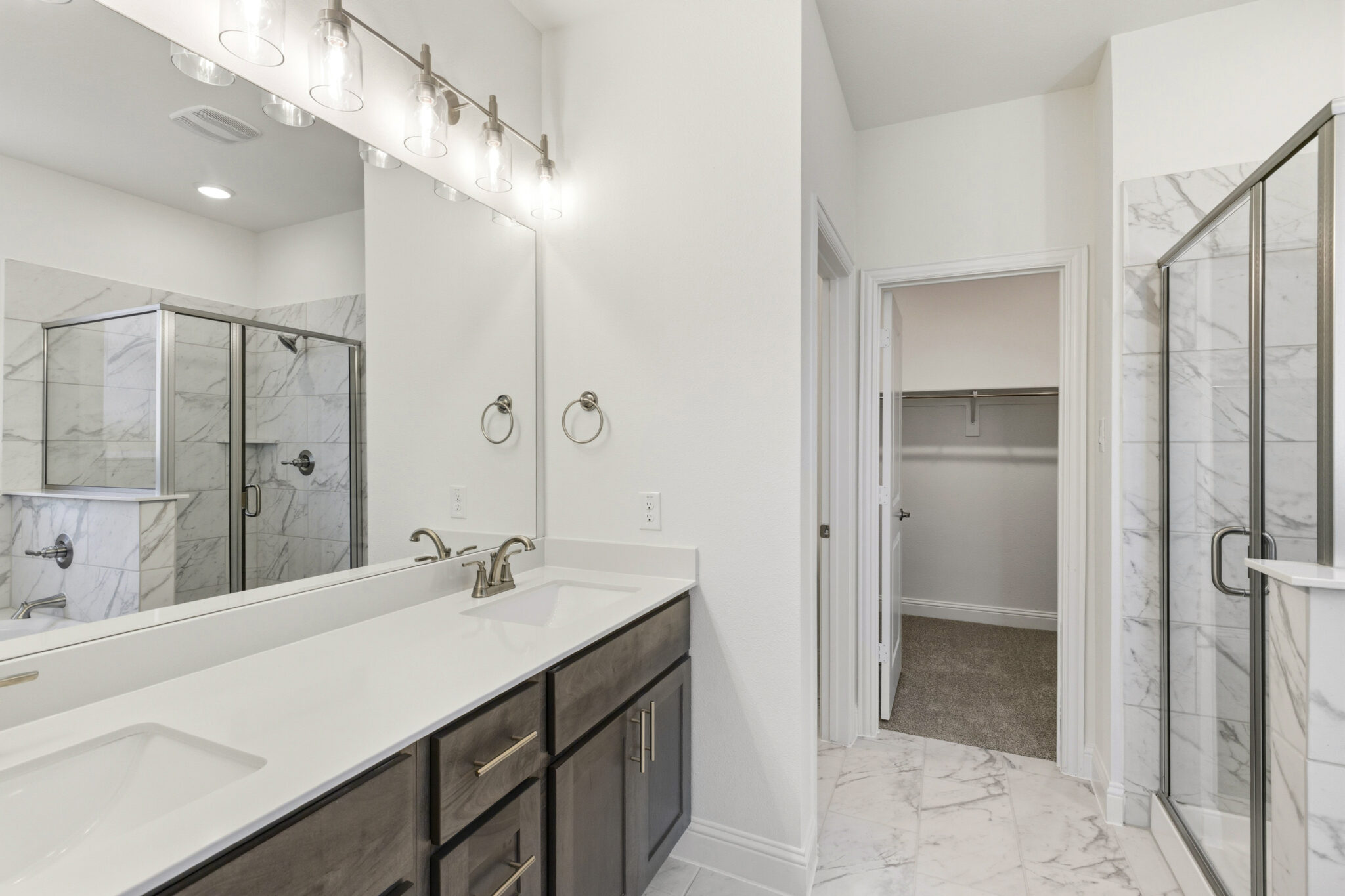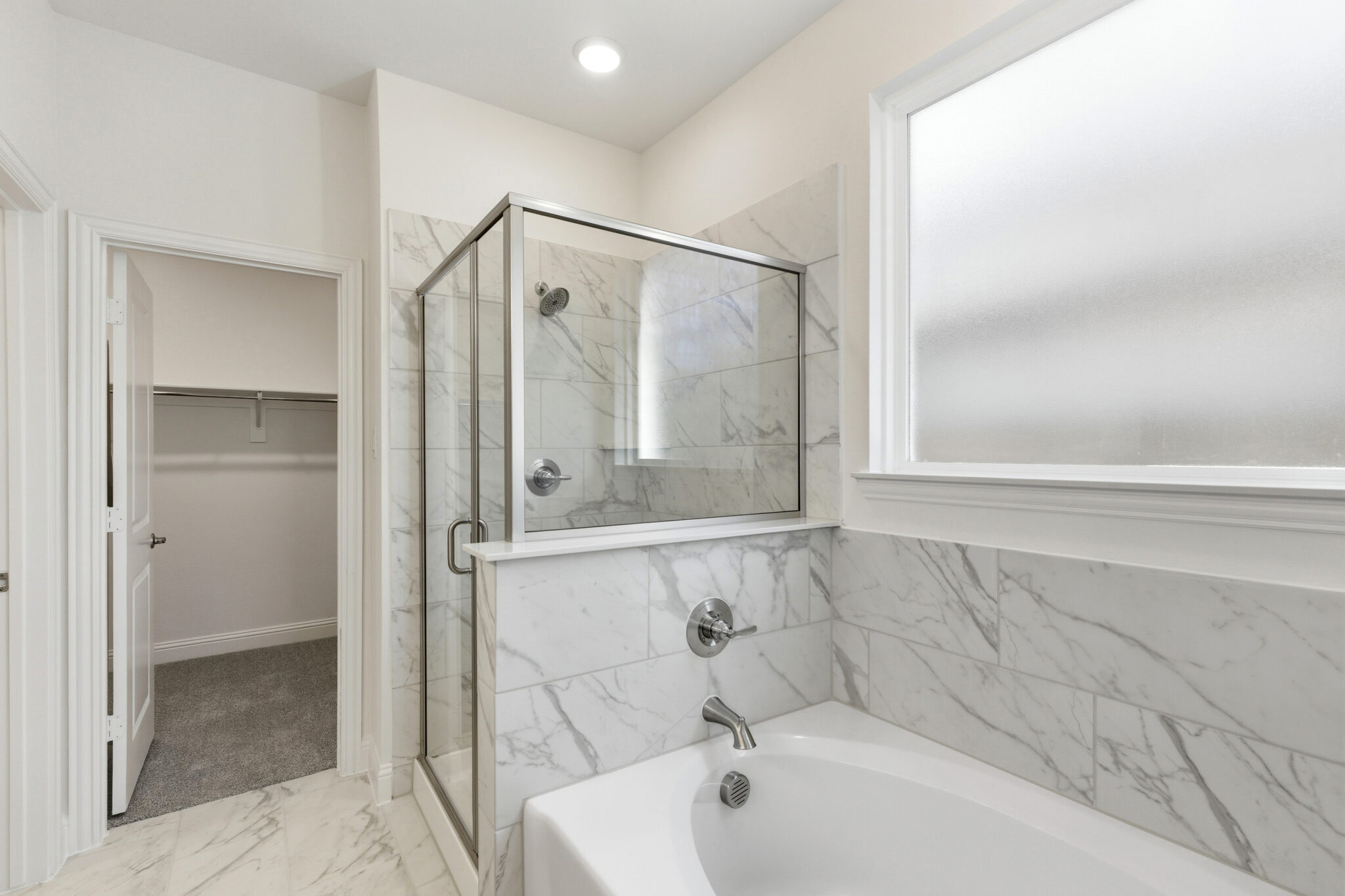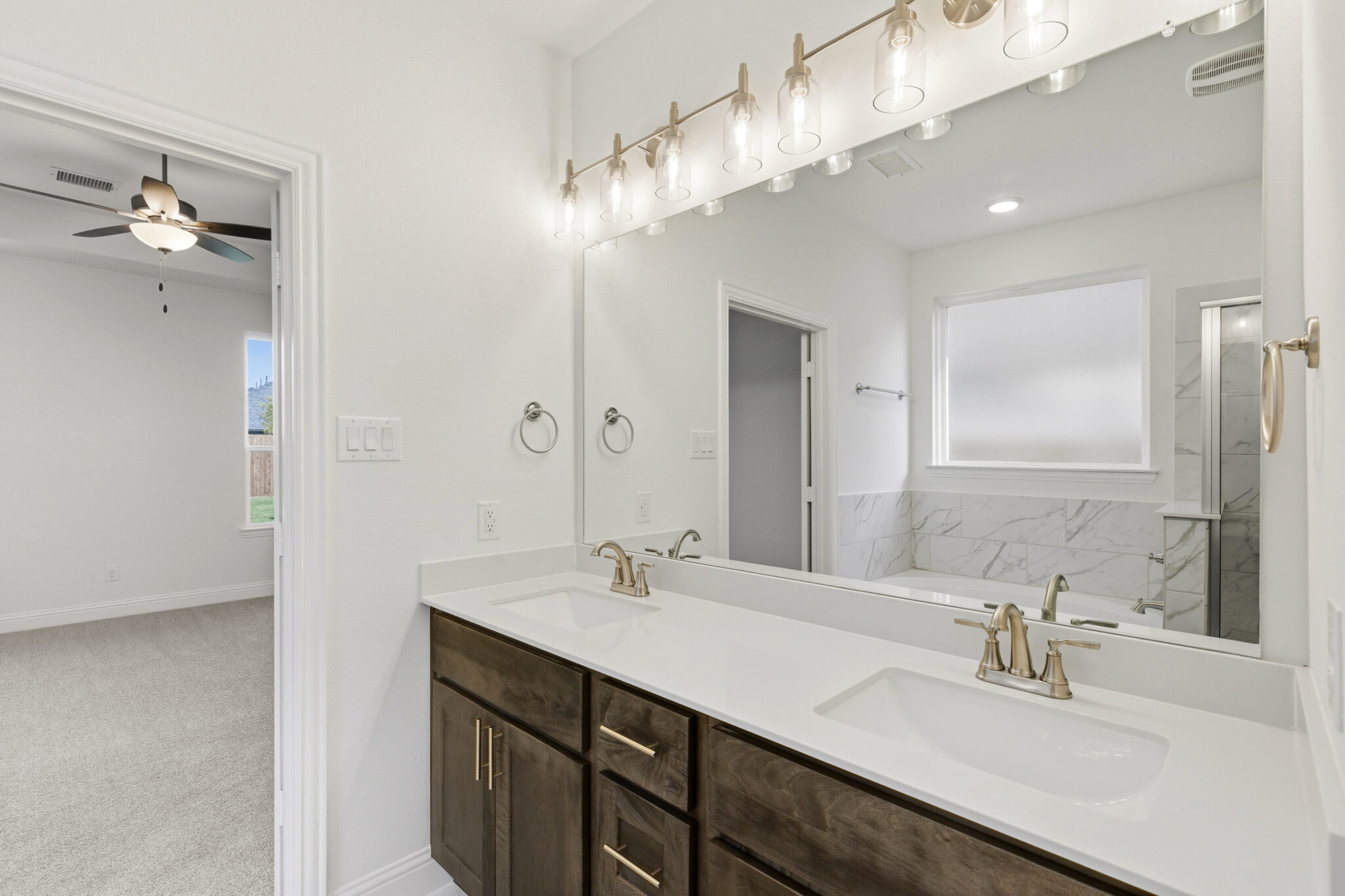 When you enter the Salado, you’re greeted by a large foyer adjacent to the open, two-story high family room and connected dining room, setting the stage for effortless entertaining. Plenty of windows in this home provide natural lighting throughout the open living spaces. The family room is adjacent to the sizeable kitchen, which features a large center island and walk-in pantry. A private study is conveniently located when you enter the house. The large soaker tub is an eye-catching fixture in the sumptuous primary bath, featuring his and hers vanities and an enormous walk-in closet – a perfect accompaniment to the spacious primary bedroom. The Salado also includes added bonuses like a large loft, walk-in closets in all secondary bedrooms and an additional full-size bathroom upstairs.