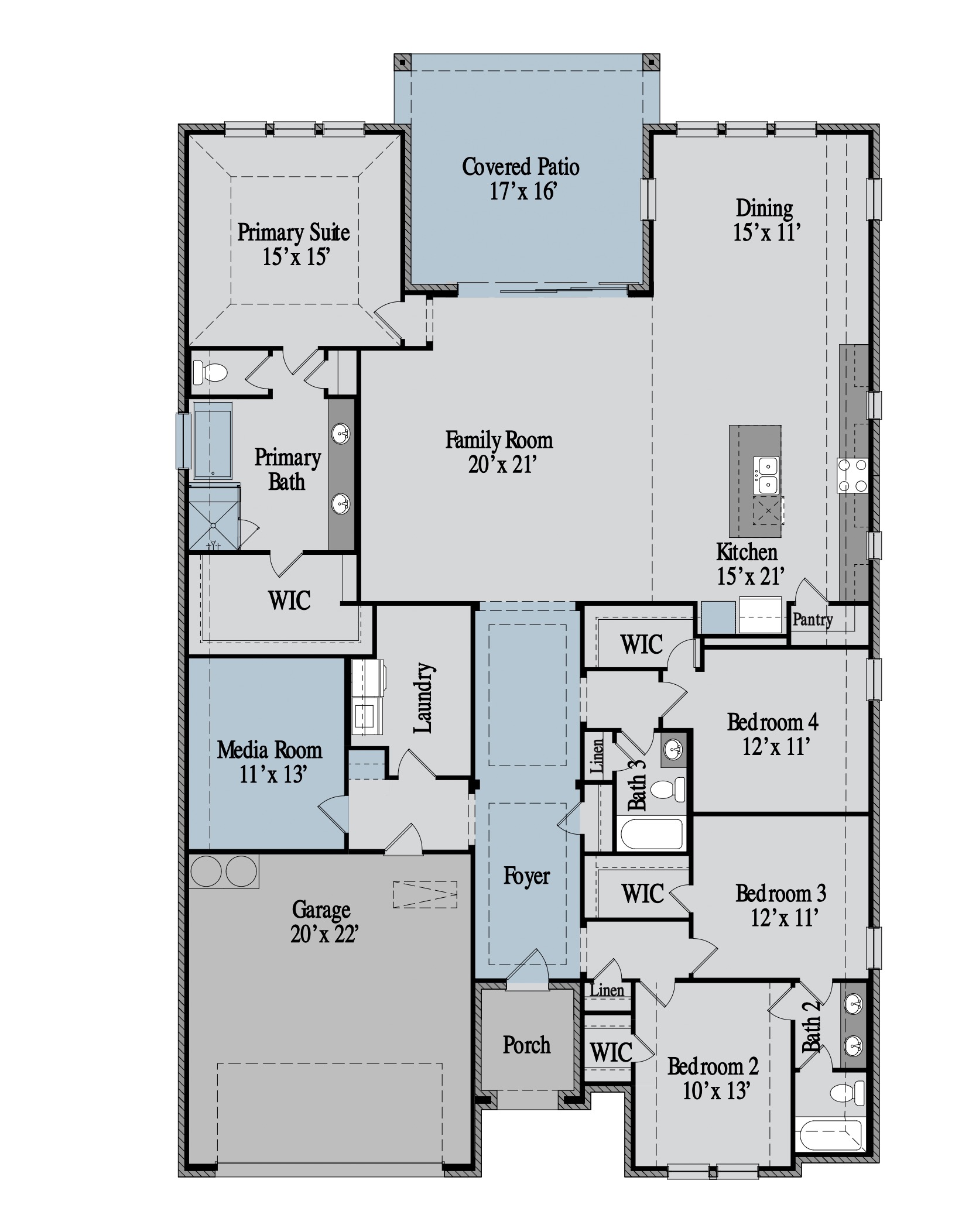 This thoughtfully designed single-story home offers an ideal balance of open living and private retreats. The spacious family room serves as the heart of the home, seamlessly connected to the dining area and a gourmet kitchen with a large island, walk-in pantry, and ample storage. A luxurious primary suite features a spa-like bath with dual vanities, a soaking tub, walk-in shower, and an oversized closet. Three secondary bedrooms each include walk-in closets and share two full baths, providing comfort and convenience for family or guests. A dedicated media room adds to the entertainment options, while the covered patio extends living outdoors. Additional highlights include a welcoming foyer, generous laundry room, and a two-car garage, making this home both practical and inviting.