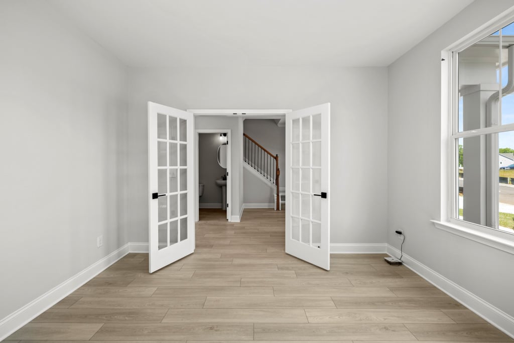 A private home office offers a comfortable, quiet space ideal for remote work. Glass French doors separate the study from the rest of the home—perfect for focus, calls, or deep work.