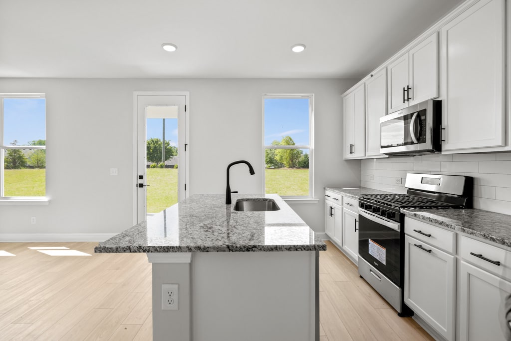 Whereas most new homes feature a microwave above the oven, our gourmet package creates a more sophisticated and versatile kitchen layout. The gourmet kitchen package is outfitted with professional grade stainless steel appliances and a 36" gas range cooktop with a lavish range hood above vented to the exterior.
