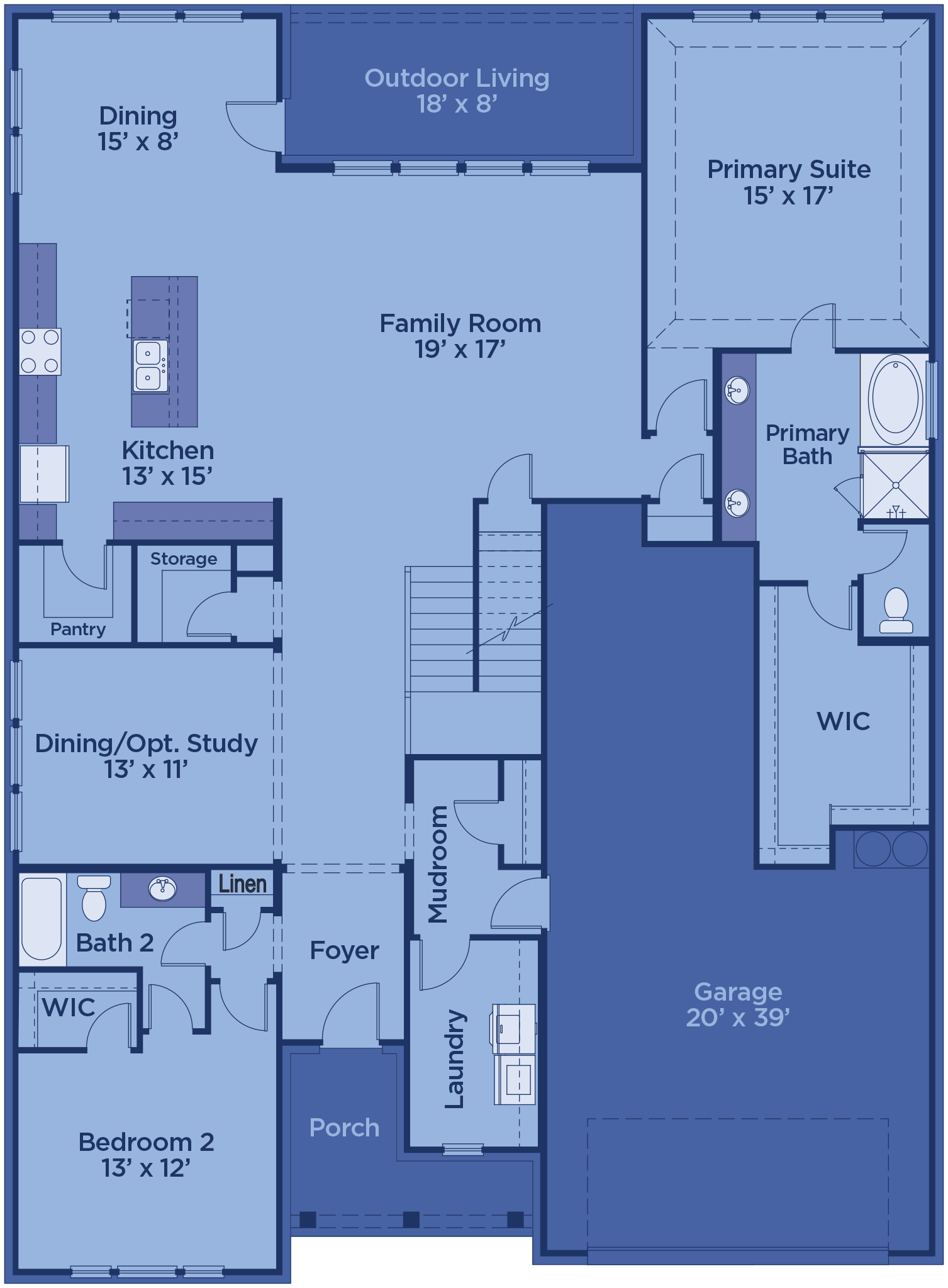 Most UnionMain Home Designs are easily customizable to include an additional one or two bedrooms. Each extra bedroom includes a walk-in closet and flexible sizing to meet your layout needs.