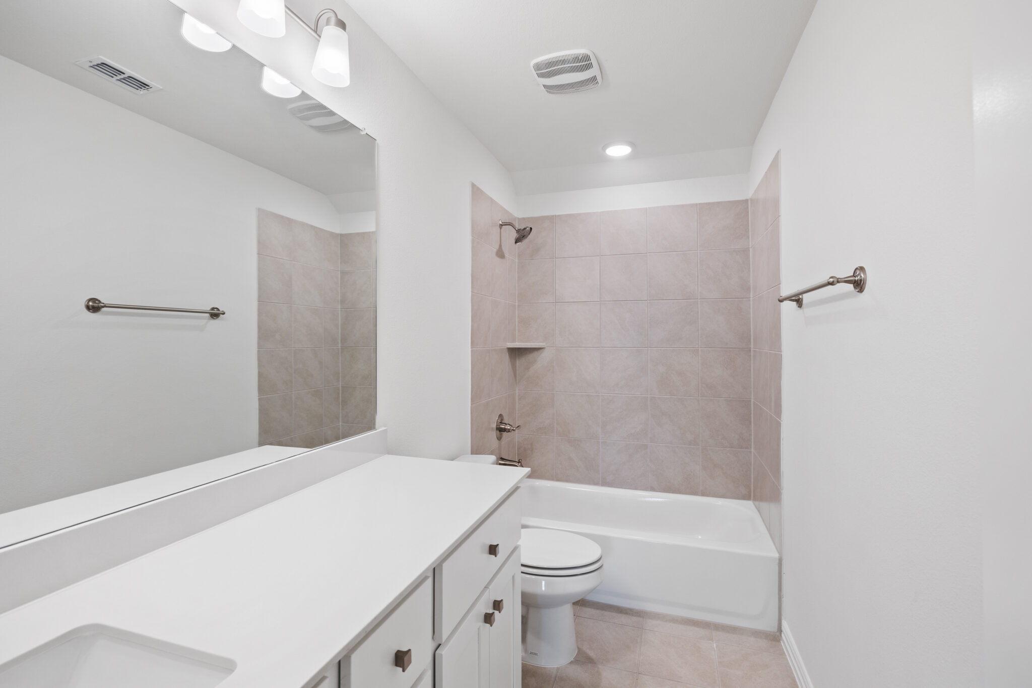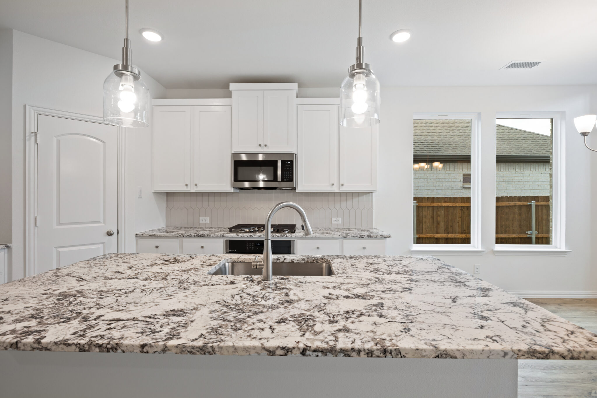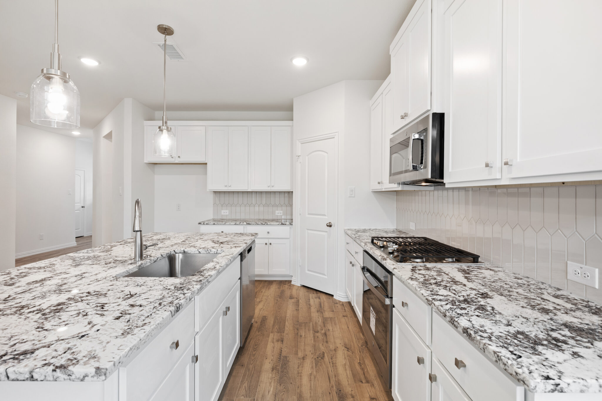 The design selections for 1126 Butterfly Dale Drive emphasize natural warmth with subtle grays. The home includes golden-toned laminate flooring paired with medium beige carpet. The kitchen features a speckled granite-inspired countertop, a soft gray backsplash, and painted Breeze cabinets with contemporary hardware. The primary bathroom continues the light stone palette, complemented by marble-inspired shower tile, while the secondary bathroom follows with a soft stone look. The overall design feels warm, balanced, and modern.