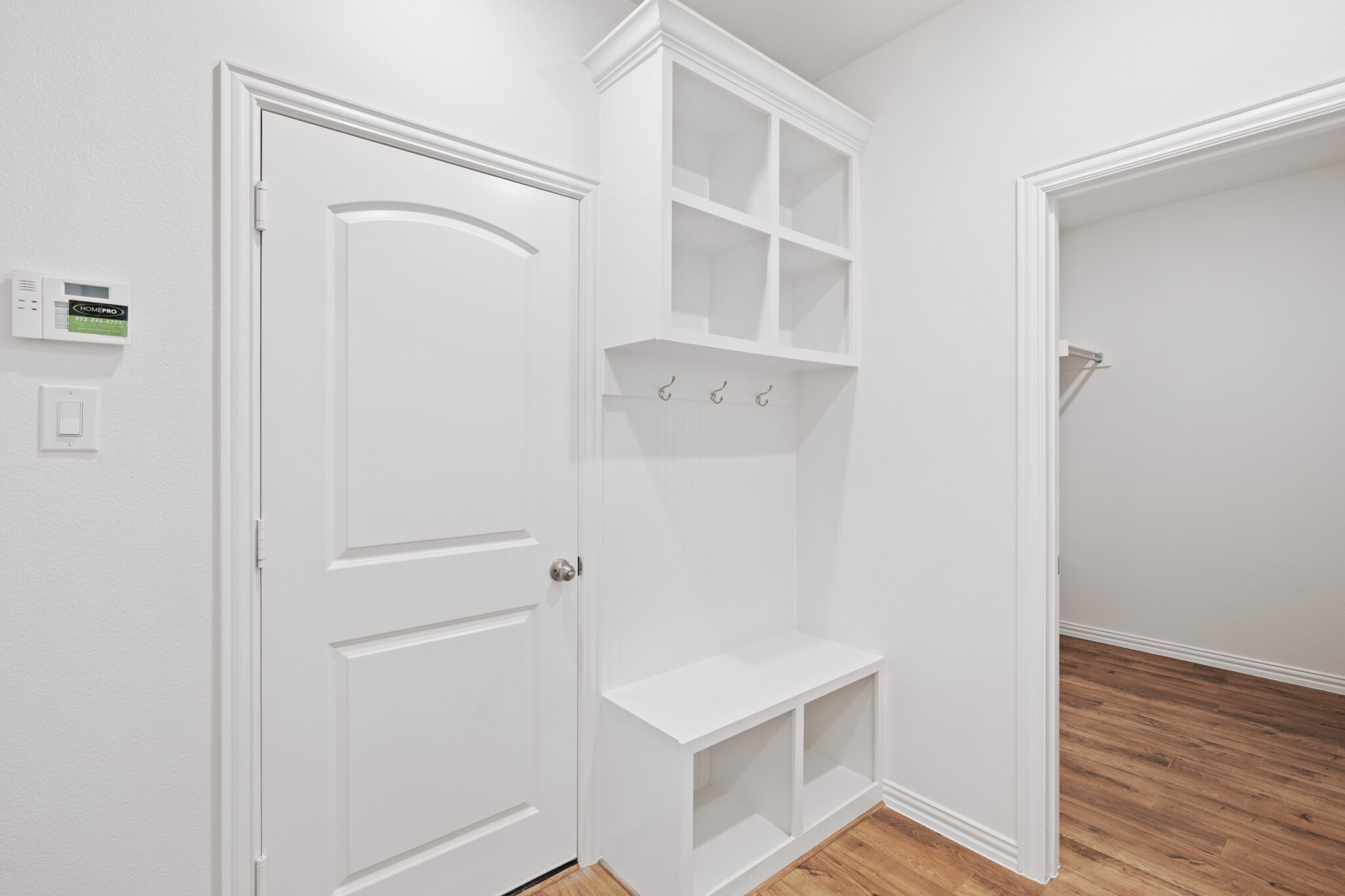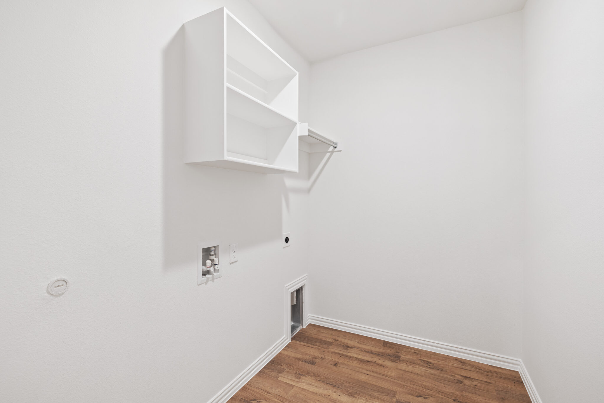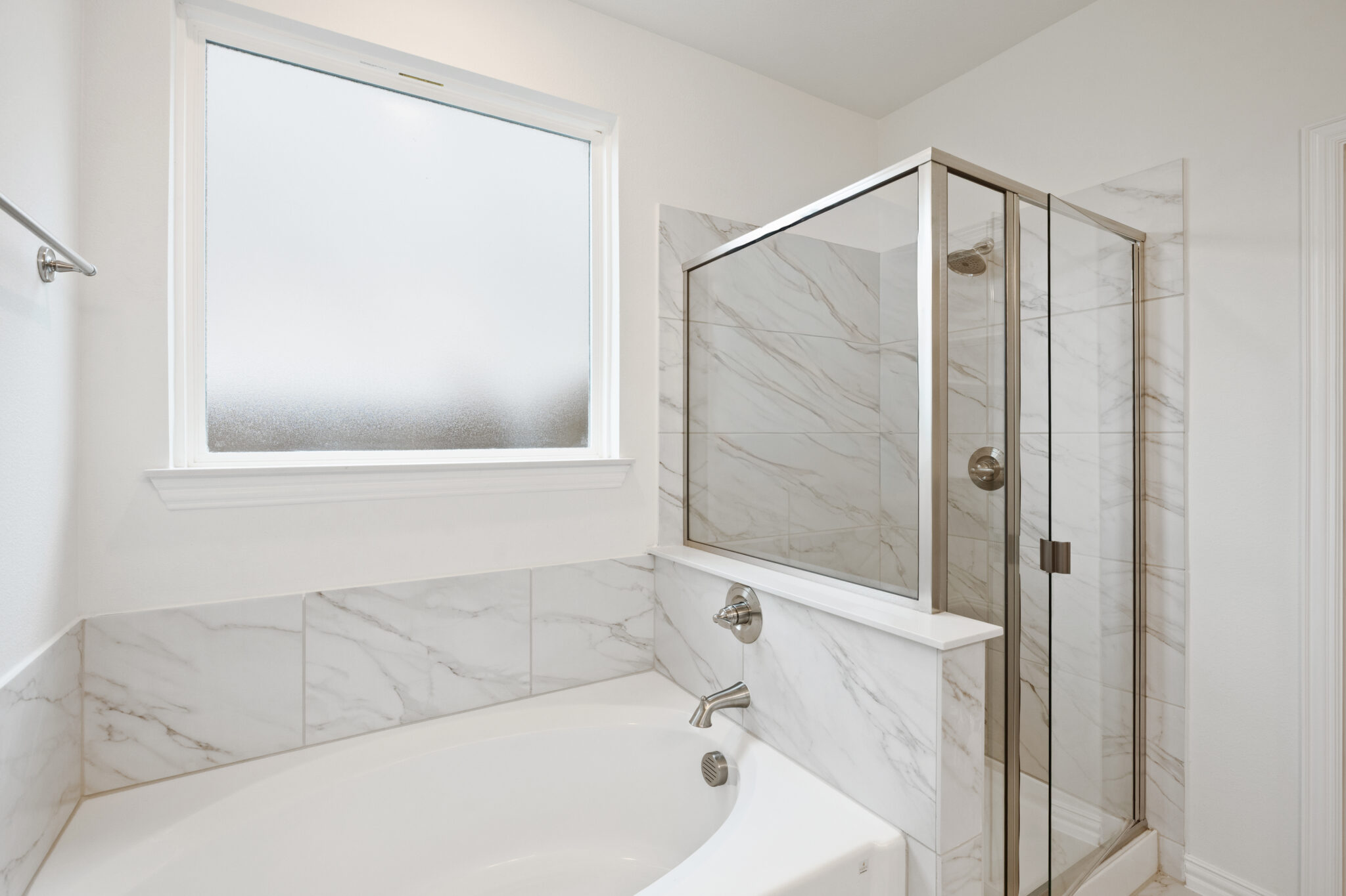 The design selections for 1126 Butterfly Dale Drive emphasize natural warmth with subtle grays. The home includes golden-toned laminate flooring paired with medium beige carpet. The kitchen features a speckled granite-inspired countertop, a soft gray backsplash, and painted Breeze cabinets with contemporary hardware. The primary bathroom continues the light stone palette, complemented by marble-inspired shower tile, while the secondary bathroom follows with a soft stone look. The overall design feels warm, balanced, and modern.