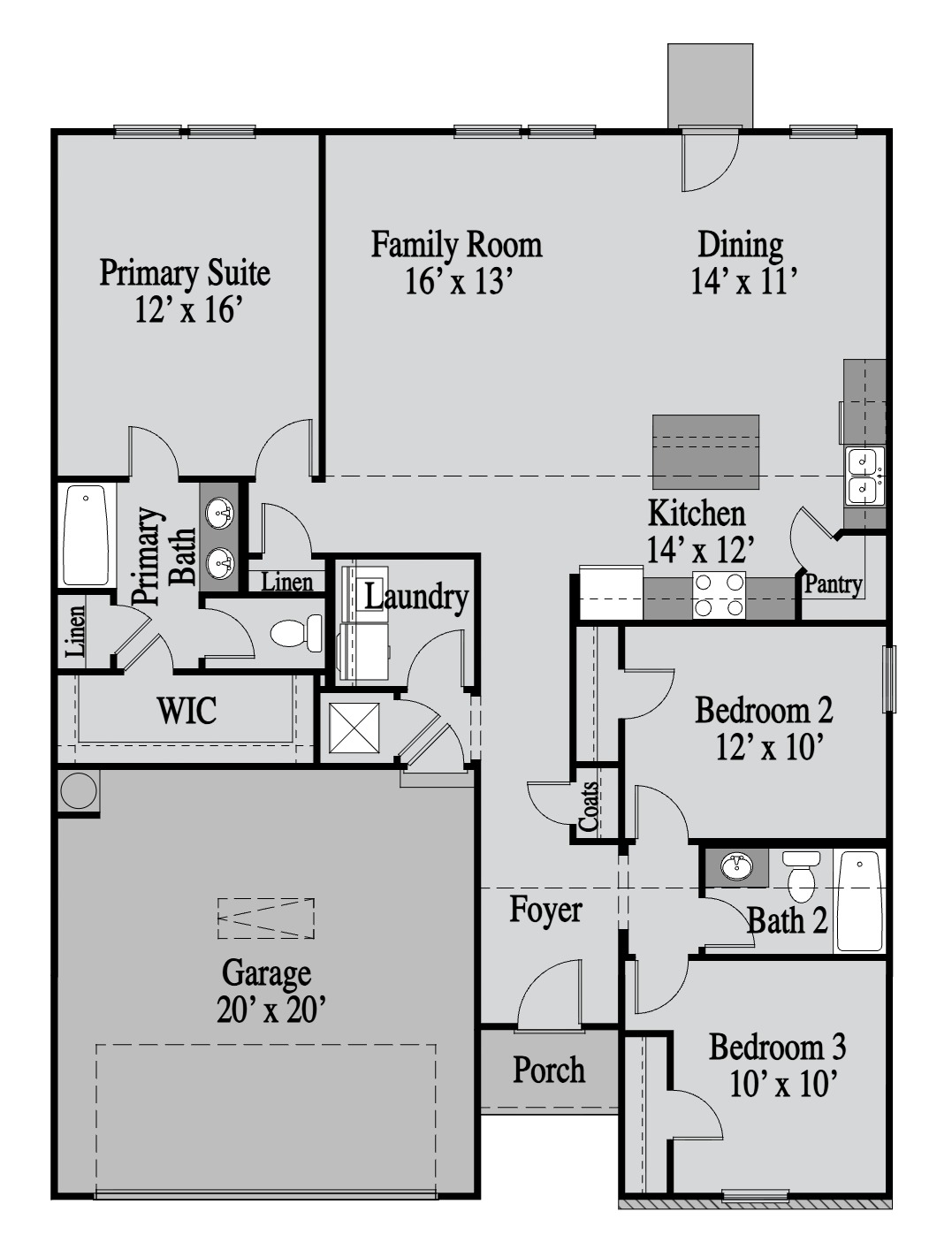 “The Athens is a thoughtfully designed single-story home offering 4 bedrooms and 2 bathrooms in a modern, open-concept layout. At the heart of the home, a spacious kitchen with a center island flows seamlessly into the dining area and family room, creating the perfect space for entertaining or everyday living. The private owner’s suite features a large walk-in closet and a luxurious en-suite bathroom. Three secondary bedrooms are positioned for privacy and share a full bathroom. Additional features include a covered front porch, a convenient laundry room, and multiple linen closets for extra storage. With its smart layout and airy design, the Athens is ideal for families seeking both comfort and functionality in a single-level home. “