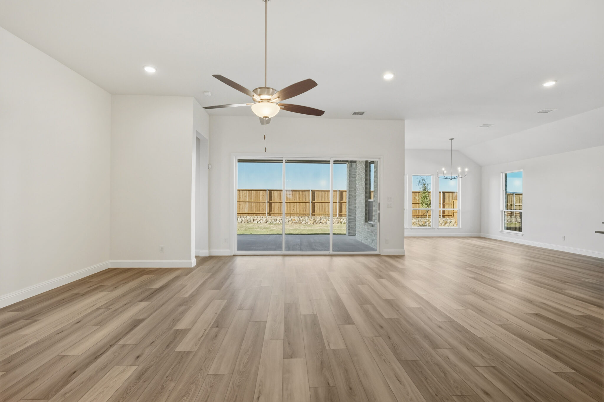 This thoughtfully designed single-story home offers an ideal balance of open living and private retreats. The spacious family room serves as the heart of the home, seamlessly connected to the dining area and a gourmet kitchen with a large island, walk-in pantry, and ample storage. A luxurious primary suite features a spa-like bath with dual vanities, a soaking tub, walk-in shower, and an oversized closet. Three secondary bedrooms each include walk-in closets and share two full baths, providing comfort and convenience for family or guests. A dedicated media room adds to the entertainment options, while the covered patio extends living outdoors. Additional highlights include a welcoming foyer, generous laundry room, and a two-car garage, making this home both practical and inviting.