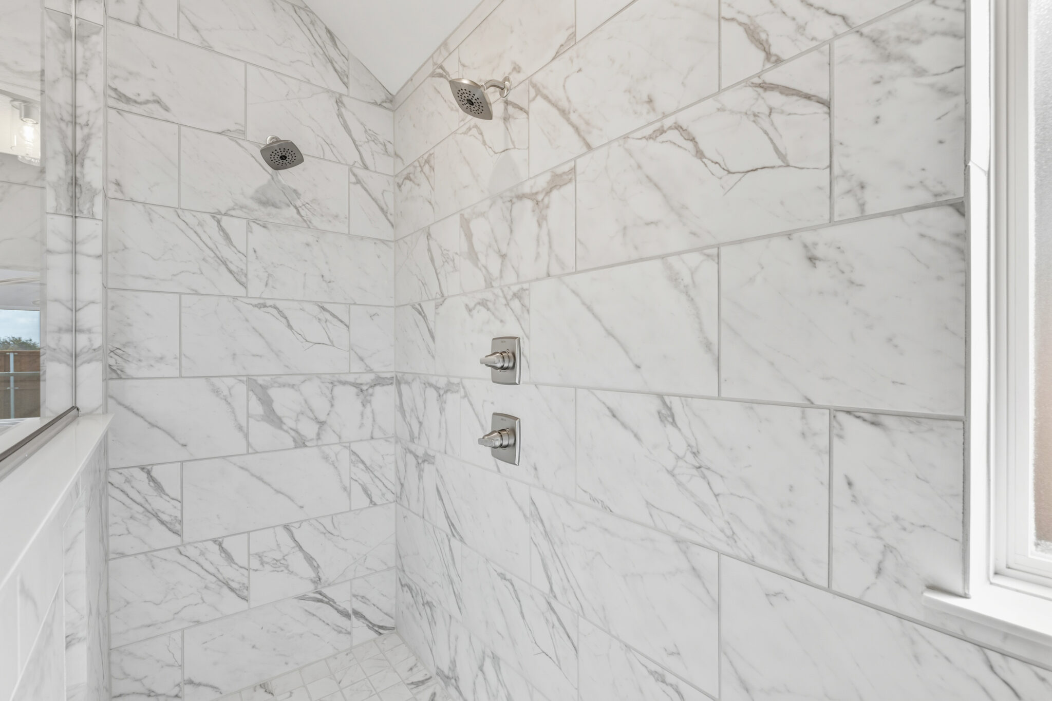 At 2007 Brackett Pond Road, the design brings together soft grays and natural warmth. The main living spaces are styled with light vinyl flooring and coordinating neutral carpet. The kitchen includes a light stone-inspired countertop, paired with a clean, bright backsplash and modern Pebble-painted cabinets accented with sleek hardware. The primary bathroom features a subtle veined surface, while marble-style shower tile adds sophistication. The secondary bathroom continues with airy stone finishes. A balanced paint scheme unifies this contemporary, serene design.