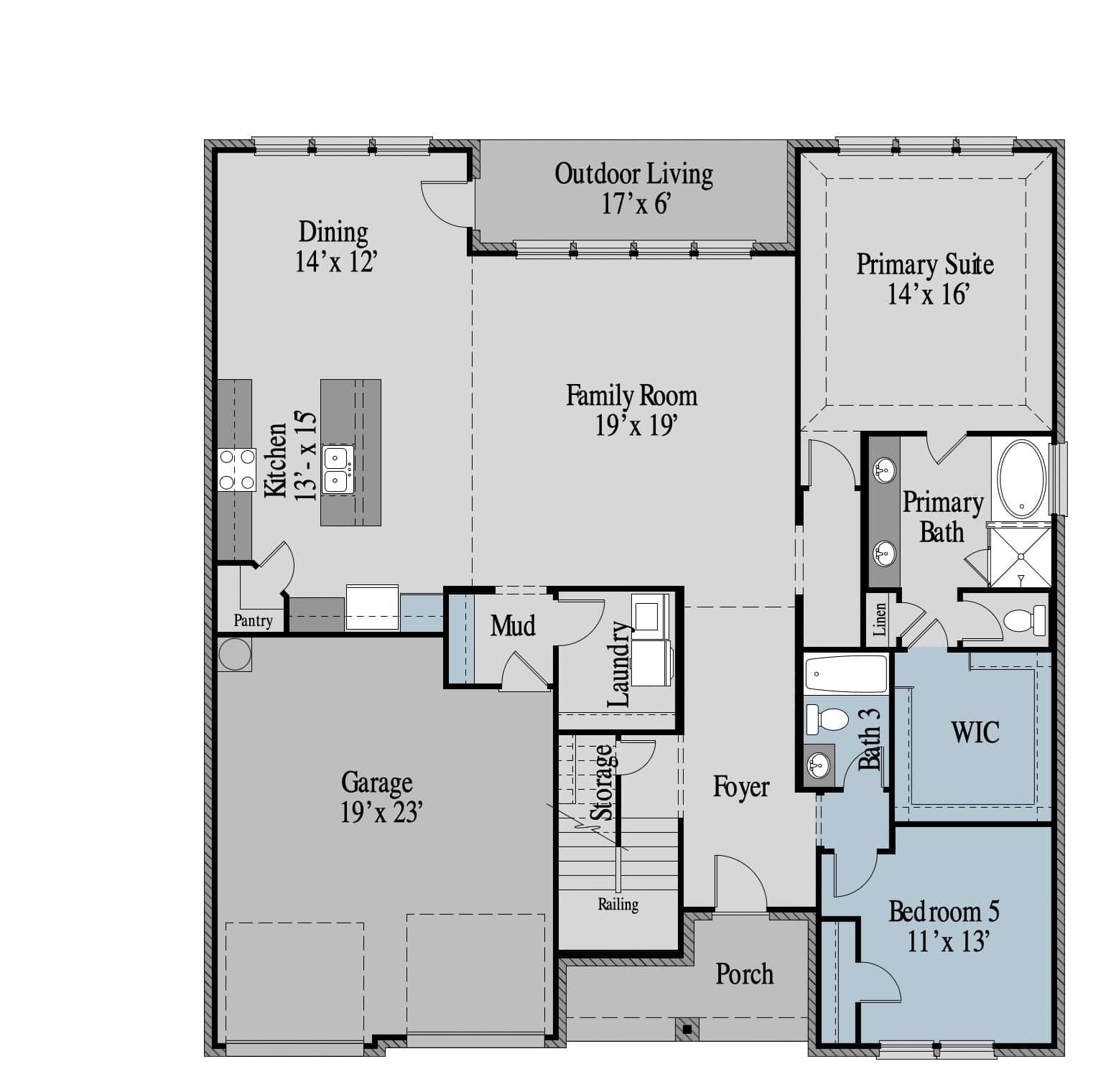 This beautiful two-story home offers the perfect blend of comfort and functionality with five bedrooms, four full baths, and a powder room. The first floor features an open-concept layout with a spacious family room that flows seamlessly into the dining area and modern kitchen with a large island and pantry, while the private primary suite boasts a luxurious bath and walk-in closet. A secondary bedroom with an adjacent bath is also located downstairs, making it ideal for guests. Upstairs, the home shines with a versatile game room, a dedicated media room, and three additional bedrooms, each with walk-in closets for ample storage. Outdoor living space and a three-car tandem garage complete this thoughtfully designed floor plan, making it perfect for both everyday living and entertaining.
